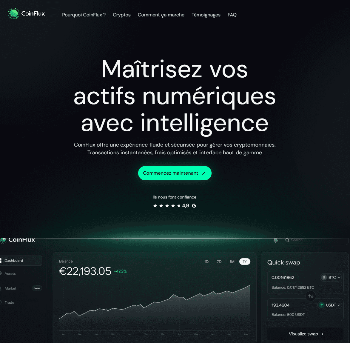 Collaboration fictive — Conception d’un site moderne pour une plateforme de gestion d’actifs numériques sécurisée. Objectif : inspirer confiance, simplifier l’accès aux cryptomonnaies et maximiser les inscriptions utilisateurs.