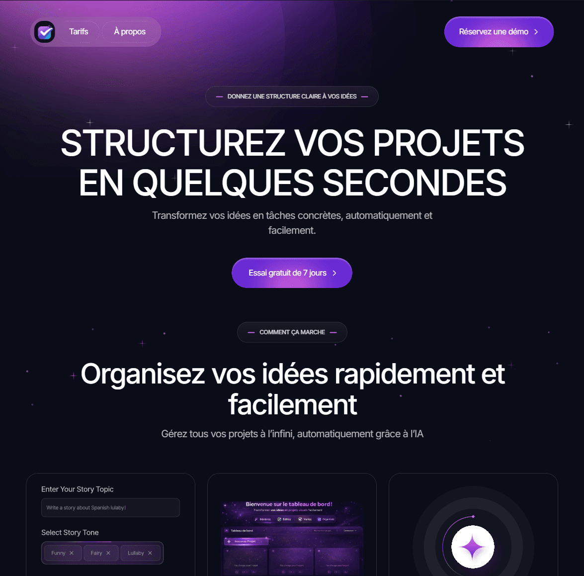 Collaboration fictive — Conception d’un site moderne pour une plateforme IA permettant de structurer et organiser des projets en quelques secondes. Objectif : simplifier la compréhension du produit, valoriser l’automatisation par IA et maximiser les inscriptions à l’essai gratuit.